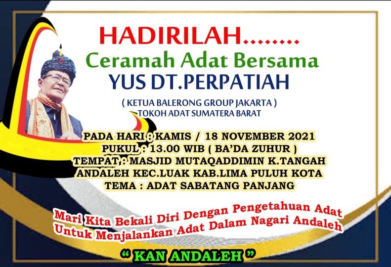 Wawancara singkat ini,di tutup dengan himbauan dari ketua KAN Andaleh kepada seluruh masyarakat Nagari Andaleh agar dapat hadir berbondong bondong menyaksikan Pituah Adat yang akan di sampaikan oleh Yus Dt Parpatiah pada Hari Kamis 18 November 2021 di Masjid Raya Mutaqaddimin Andaleh setelah sholat zuhur. " Ayok hadiri dan ramaikan, Pituah Adat betema Adat Sabatang Panjang, terbuka untuk umum." imbuh beliau menutup pembicaraan.