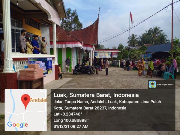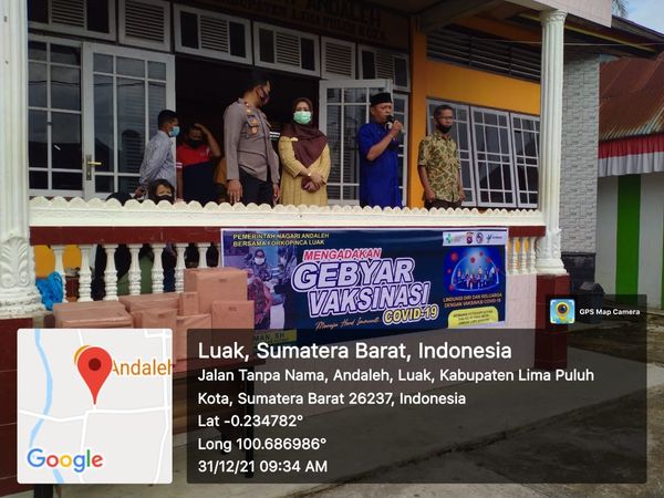 Bekerjasama dengan Forkopinca Luak, Pemerintah Nagari Andaleh menggelar Gebyar Vaksinasi Covid 19, Sabtu tanggal 31 Desember 2021. Acara yang di adakan di penghujung tahun ini di gagas oleh Camat Luak, Puskesmas Mungo, Kapolsek Luak dan di dukung oleh Anggota DPRD Lima Puluh Kota. Gebyar vaksinasi covid 19 kali ini di laksanakan di halaman Komplek Perkantoran Wali Nagari Andaleh.
