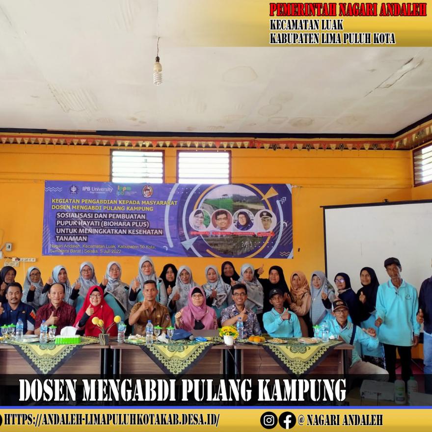 Andaleh,05 Juli 2022 Dibalai Balai Pertemuan (Balai Adat) dalam Acara dosen mengabdi Pulang kampung yang di Selenggarakan Oleh dosen IPB (Institu Pertanian Bogor) dengan diikuti Oleh Kelompok Tani Balibu Jorong Baliak Bukik,. Dalam acara yang berlansung dari jam 09.00Wib tersebut dimulai dengan Sabutan dari Bapak Wali Nagari Andaleh.